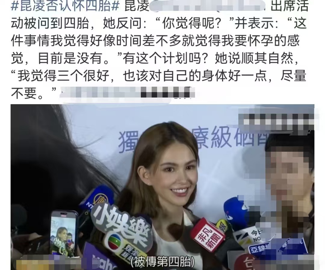 她还坦诚表态:“怀四胎顺其自然,现在三个小孩挺好的,我也该对自己身体好点,所以尽量不考虑(四胎)。” 这话背后,是她实实在在的身体顾虑 ——2015 到 2022 年这 7 年里,昆凌已剖腹产三次。咱们都知道,剖腹产对身体伤害不小,多来几次不仅子宫难恢复,还可能有其他健康风险。她自己也说过,生完孩子后免疫力下降、体力大不如前,明星的身体也经不起反复折腾。