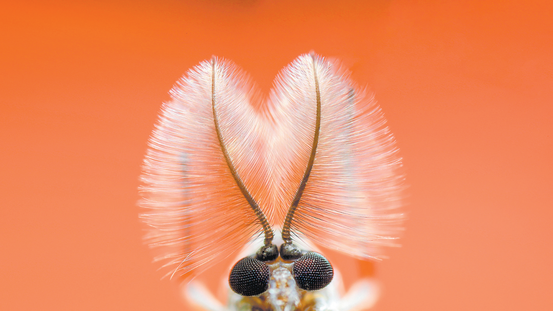 点评:蚊蝇给人的印象是脏与丑,但从微观视角下观察,却又让我们惊叹造物主的神奇。照片通过微距将摇蚊对称的环毛状触角和复眼做了生动表现,被强烈虚化的大面积红色背景提供了生动的色彩渲染。