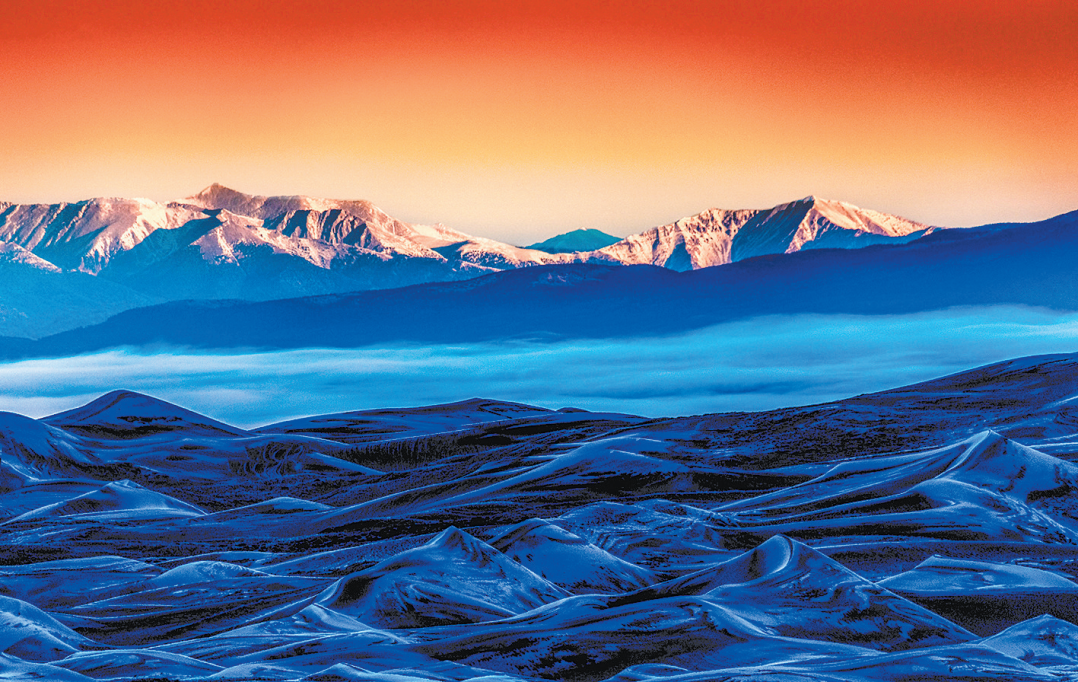 例如《夕照仙桃峰》,当落日与仙桃峰相叠时,用600mm长焦镜头拍摄,加深观者对仙桃峰的印象。拍摄《沙丘与山峰》这张照片时,它的近处全是沙棘植物,人和车都无法靠近,只有用长焦镜头拉近拍摄。我用600mm长焦镜头,在寒风里等待日出,当太阳出来,天空变红时按下快门。