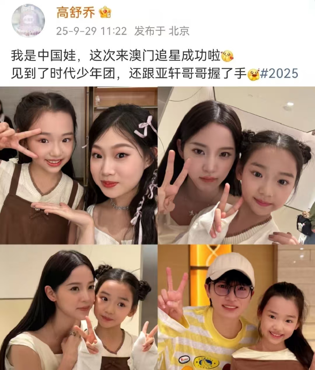 9 月 29 日,小酒窝在微博用孩子气的话分享:“这次来澳门追星成功啦!还跟亚轩哥哥握了手。” 文字里的感叹号藏不住开心,评论区满是祝福,有人羡慕她运气好,有人感慨 “星二代也像普通小孩一样为偶像开心”,还有人想起宋亚轩早年唱《夜空中最亮的星》的样子,“现在他真成了照亮小粉丝的星星”。