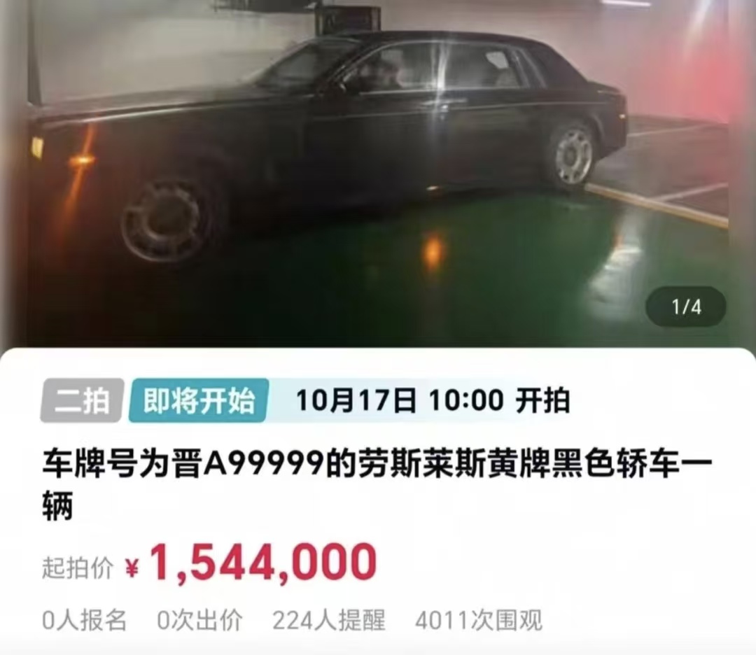 10 月 12 号,有人发现阿里司法拍卖平台上,山西阳泉市中级人民法院打算在 10 月 17 号,通过这个平台公开拍卖一辆特别的豪车 —— 一辆黄色车牌的黑色劳斯莱斯,起拍价定在了 154.4 万元。