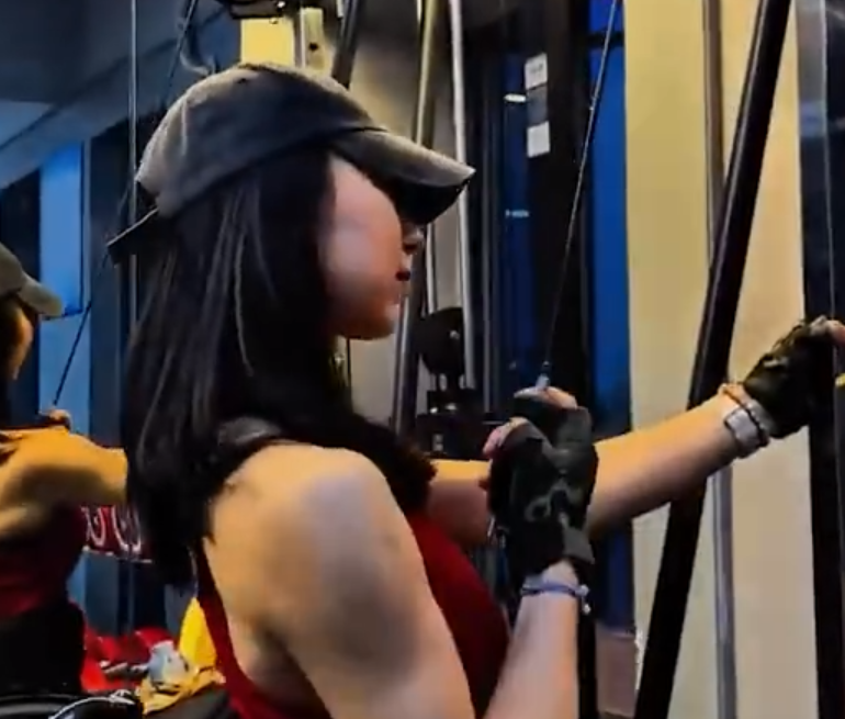 其实熟悉黄同学的人都知道,她早就是个健身爱好者了,没出事前就经常泡健身房。2025 年 2 月,身体稍微稳定些,她就忍不住想:下半身动不了,那上半身总不能闲着。于是她又回到了健身房,只不过这次,她得坐着轮椅训练。