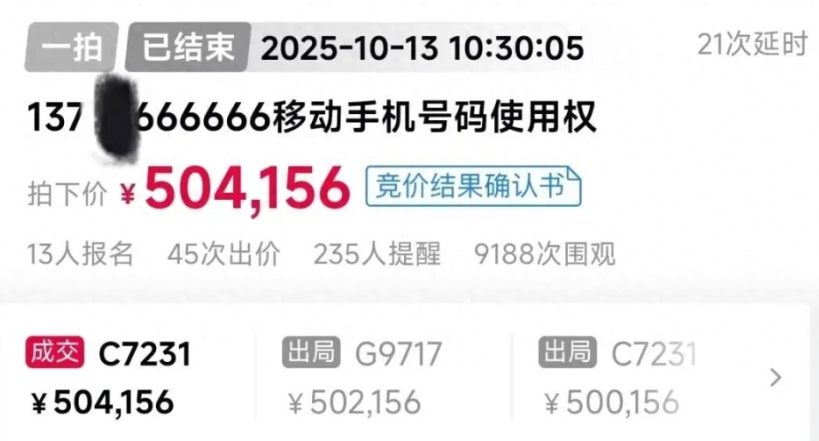 10 月 13 号,拍卖平台上两个 “靓号” 走出了完全不同的行情:一个尾号是 “666666” 的手机号,被 13 个人抢着出价,来来回回拍了 45 轮,还因为有人不断加价,多延时了 21 次,最后以 50.4156 万元成交;另一个尾号 “888888” 的手机号,起拍价 100 万元,结果从头到尾没人出价,直接流拍了。