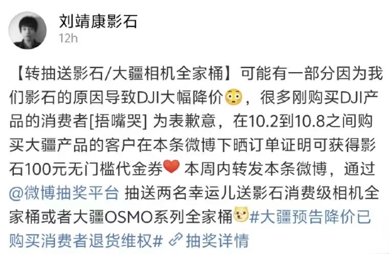 就在舆论聚焦大疆时,影石 CEO 刘靖康 10 月 13 日微博致歉,称 “或因影石致大疆降价”,还为国庆买大疆的用户送 100 元代金券、抽设备 “全家桶”。这番操作引热议,有人赞高情商营销,有人疑蹭热度。