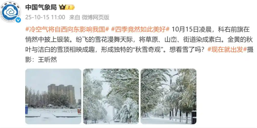 10 月 15 号一早上,“下雪” 这俩字直接冲上微博热搜第一,打开一看才知道,北方不少地方已经飘起今年立秋后的第一场雪了!