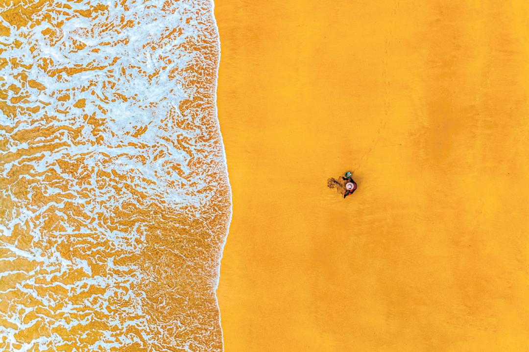 利用无人机的3倍中焦拍摄渔民赶海劳作与海浪的细节。 项锦伟 摄