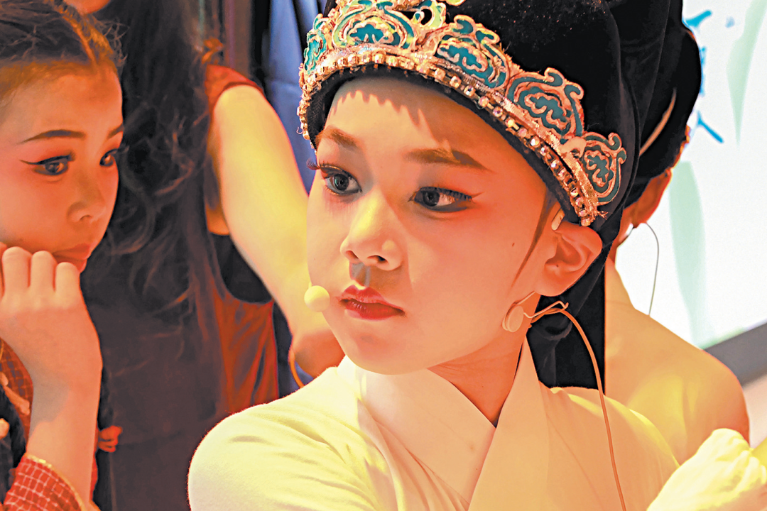 小学员在家中跟着父亲学唱越剧。