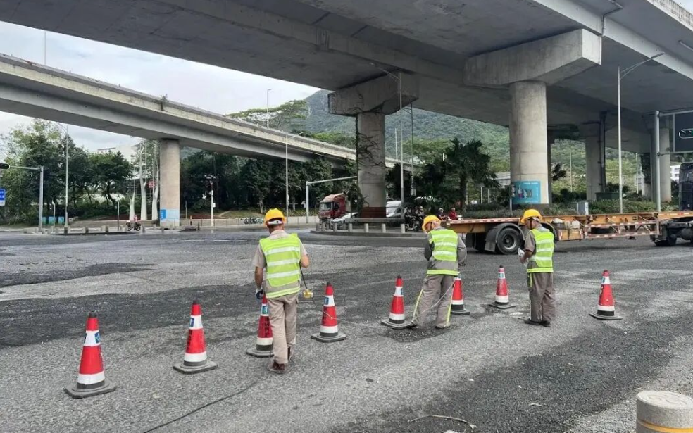 结果第二天早上 9 点多,记者赶到这个路口的时候,就看到工程人员已经进场施工了。盐田区建筑工务署的工作人员说:“这个路口之前是沥青混凝土路面,之前也修过几次,但因为经常有重型货柜车在这里掉头转弯,长期压着,所以老坏。其实在‘卷尺哥’发视频之前,我们已经把这个路口的整改提上日程了,施工方案和交通疏解方案都定好了,刚好就定在 21 号动工。这次我们用高强度混凝土来修,虽然工期要一个月左右,但修好后肯定耐用很多。也感谢这位热心网友的关注,等修复完成了,我们还想邀请他再来看看,体验一下变化。”