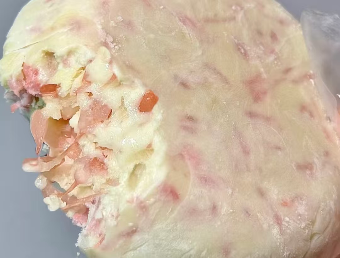 然后把之前处理好的红柚果肉和少许红柚汁倒进酸奶液里,搅的时候动作轻一点,别把果肉搅碎了,让果肉均匀散在酸奶液里就好。要是你喜欢分层的样子,也可以先倒一半酸奶液在模具里,放冰箱冷藏 10 分钟定型,再铺一层红柚果肉,倒剩下的酸奶液,这样成品层次更明显,拍照也更出片。