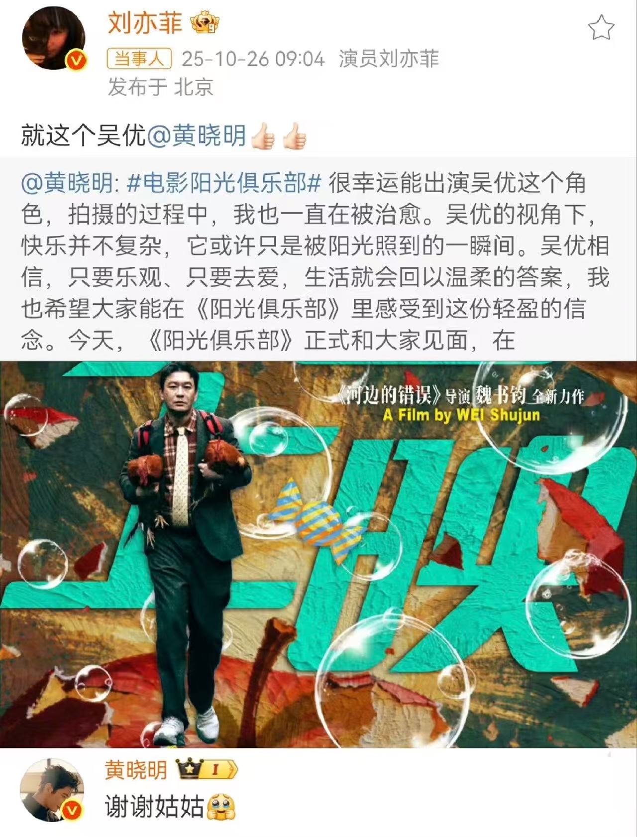 10 月 26 日,刘亦菲一条微博让黄晓明的新片《阳光俱乐部》突然火了。她没发复杂文案,就简单一句 “快乐或许只是被阳光照到的一瞬间,只要乐观去爱,生活就会回以温柔”,精准戳中电影里主角的治愈内核。而黄晓明秒回的 “谢谢姑姑” 四个字,直接让网友集体破防 —— 这不是《神雕侠侣》里杨过对小龙女的称呼吗?