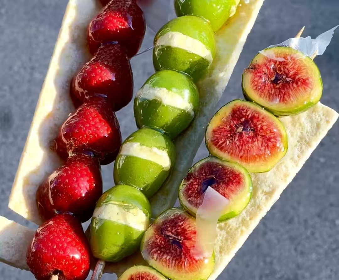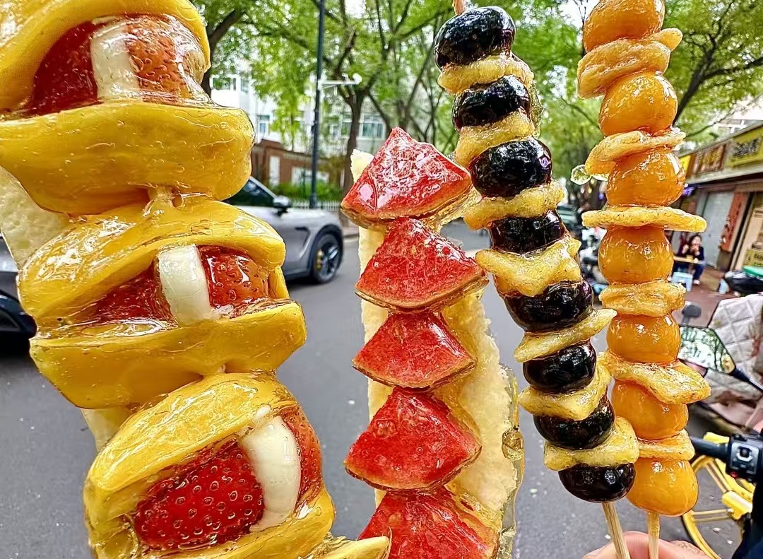 走近了能看见,店里三个师傅忙得不停手,操作台上摆得整整齐齐:去核的山楂红亮亮的,冷藏过的冷萃酸奶装在白桶里,还有磨得碎碎的奶皮子。师傅们先拿勺子舀酸奶,往山楂上裹得匀匀的,再把串好的山楂放进奶皮子碎里滚一圈,碎末子牢牢粘在酸奶上,看着就软乎乎的。刚做好的糖葫芦立马放进冷藏柜,有排队的人问为啥这么讲究,穿蓝围裙的张师傅一边打包一边笑:“这串儿得保着凉,不然酸奶化了,酸甜味儿就差远了!” 他还说,这新品是月初才上的,没成想半个月就火了,“现在一天能卖三百多串,比咱老款的糖葫芦多卖了一倍还不止!”