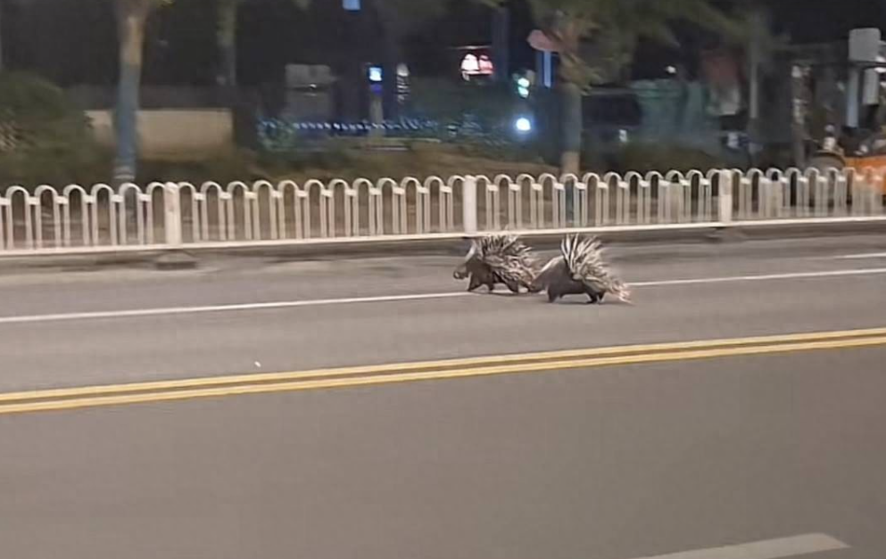 10 月 29 日晚上 8 点多,南京市民王先生刚加完班,沿着红山动物园附近的和燕路往家走。走着走着,他突然瞥见前方不远处的马路边,有两个黑乎乎的小东西在动。“一开始还以为是流浪猫或者野兔子,走近了才看清,我的天,居然是豪猪!” 王先生后来跟记者说,那两只豪猪差不多有半只小狗那么大,身上的尖刺一根根竖着,在路灯底下泛着淡淡的光。
