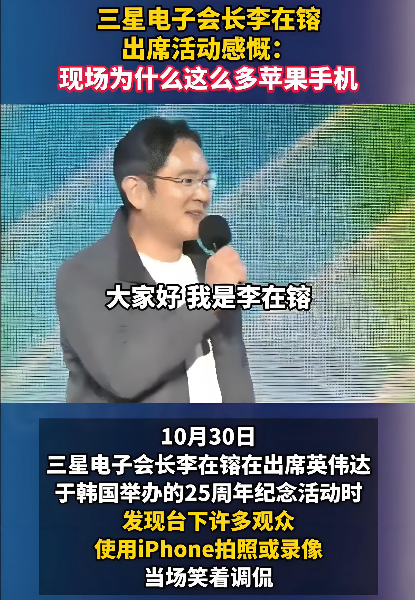 三星电子会长李在镕出席英伟达在韩国举办的25周年纪念活动时,现场发言期间发现台下观众‌多数使用iPhone‌进行拍照或录像,他笑着调侃道:“现场为什么这么多苹果手机呢?”这句自嘲背后,实则折射出三星与苹果的竞争博弈及三星的生存困境。