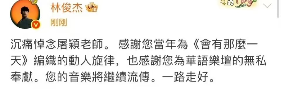 林志炫在文中说,屠颖是自己特别敬重的乐坛前辈,没想到走得这么突然,心里又惊又痛。他还记得屠颖用音乐为舞台添彩,帮同行者照亮前路,这份风度和那些动人的音符,一定会永远留在大家心里。林俊杰则带着难过回忆,当年屠颖为自己的《会有那么一天》编曲,那段旋律至今让人难忘。他还说,屠颖为华语乐坛付出了太多,这些贡献大家都记在心里,愿他一路走好。