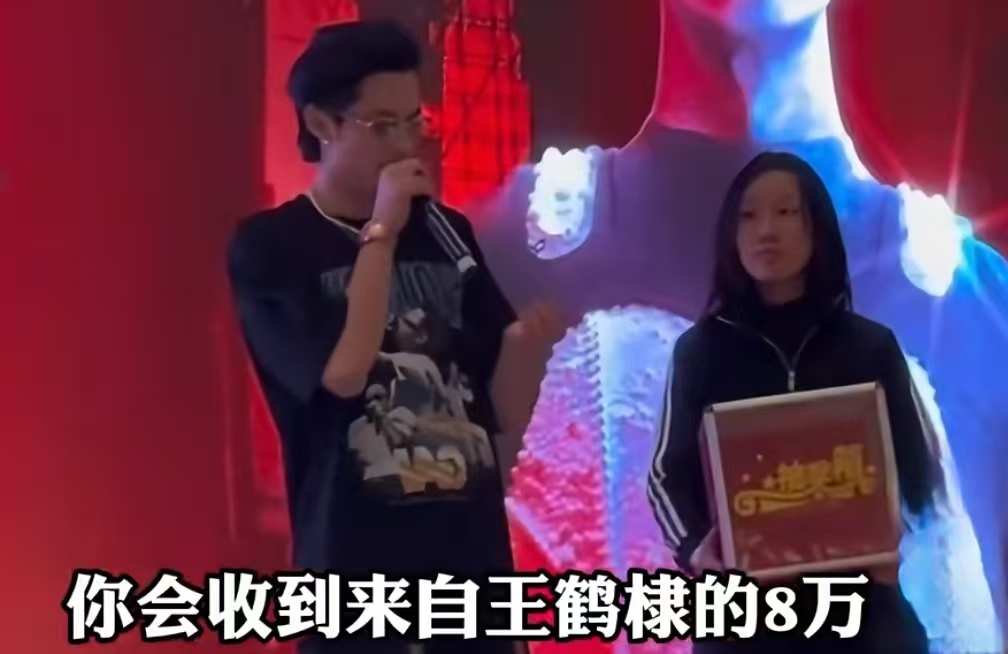 这场即兴抽奖充满了小插曲。王鹤棣没搞复杂流程,随手就指向了人群中举得最高的一位男生。这位幸运儿被惊喜冲昏了头,踩着椅子就往舞台上冲,速度太快没刹住,直接把王鹤棣撞得后退两步。没想到王鹤棣一点不生气,稳住身形后拍着他的肩膀大笑:“兄弟你这劲儿也太足了,打篮球肯定是一把好手!” 说着就掏出手机加好友,当场转了 8 万元,转账备注 “棣棣的庆功红包”,让在场的人都羡慕不已。