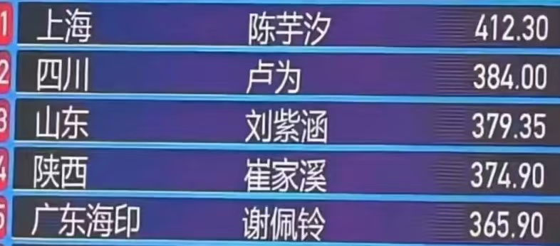 赛场另一边,卢为也没闲着。这位同样实力不俗的选手全程敢打敢拼,好几轮动作都拿出了看家本领。尤其是第四轮的向后翻腾两周半转体两周,她在空中的转体又快又稳,落水时的水花控制得相当出色,这一跳直接让她的排名往前冲了不少。虽然最终没能超过陈芋汐,但 384.00 分的成绩也足够亮眼,银牌拿得实至名归,展现出了顶尖选手的硬实力。