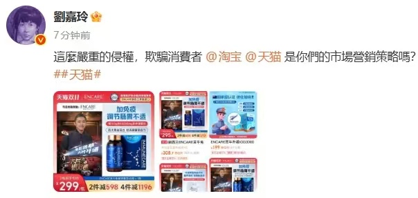 双 11 购物季正热,刘嘉玲的一则霸气喊话直接引爆全网!11 月 10 日,她在社交平台晒出天猫国际 “ENCARE 海外旗舰店” 的商品截图,只见梁朝伟的半身照被醒目地挂在一款保健品首页,看着妥妥的明星代言架势,可点进详情页翻遍了也没找到任何授权说明。刘嘉玲当场怒怼淘宝、天猫:“这么严重的侵权,还明目张胆欺骗消费者,难道这就是你们默许的营销套路?”