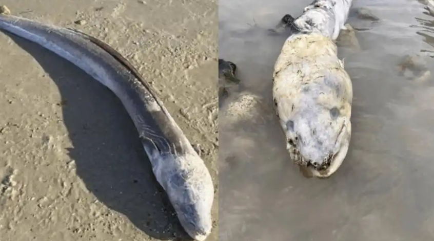 这事得从11月2日说起。43岁的卡塔琳娜·德莱尼像往常一样,牵着狗在海边散步。走着走着,她突然瞥见沙滩上卧着个大家伙,灰蓝色的身子又长又粗,脑袋也比一般鱼大得多,模样怪得很。“活这么大从没见过这东西,看着像条巨型鳗鱼,当时整个人都看傻了。”卡塔琳娜赶紧掏出手机拍了照片,发到社交网上。