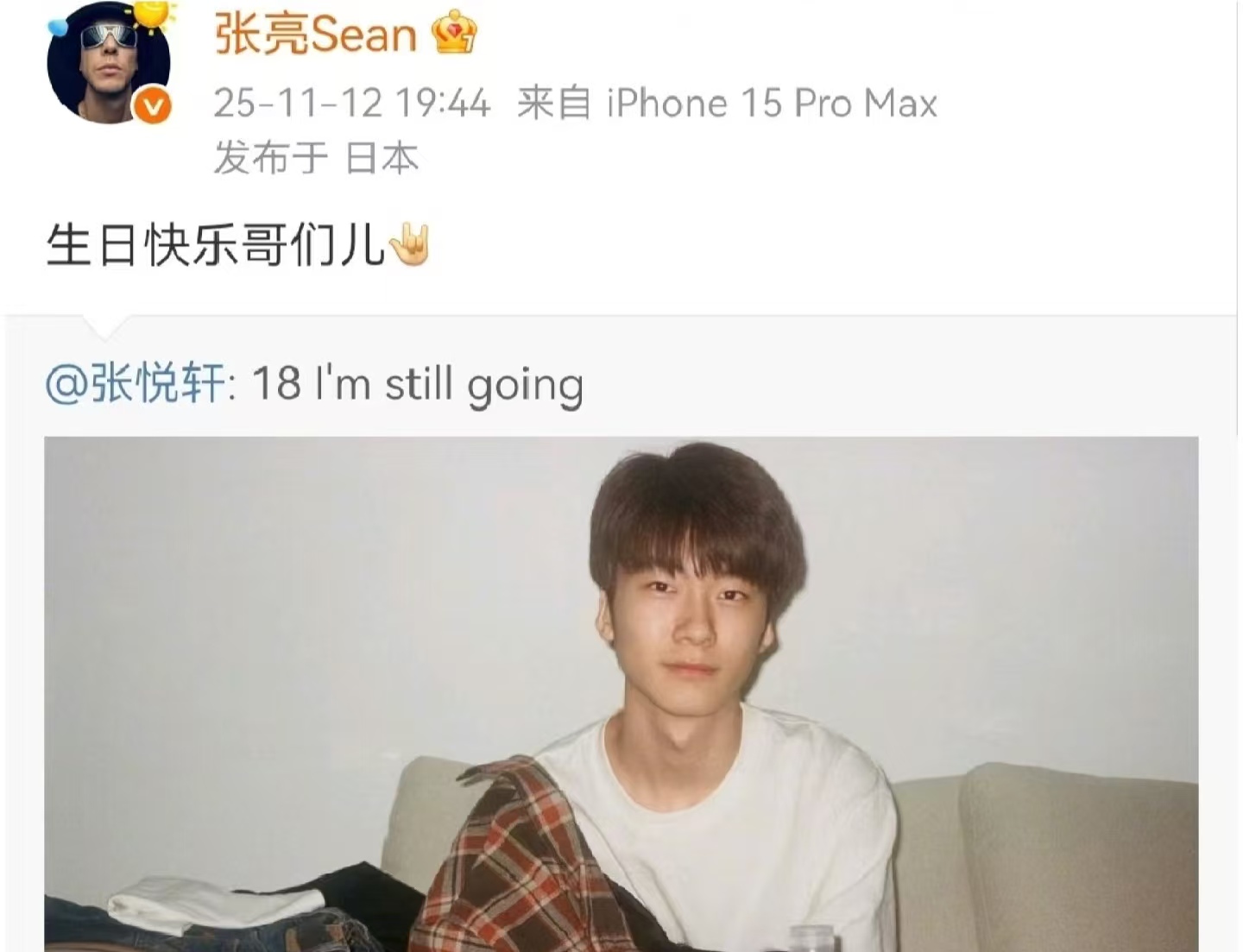 2025 年 11 月 12 日,张悦轩(天天)的 18 岁生日动态直接刷爆社交平台!他晒出的自拍里,浅亚麻色头发的少年穿件简单白 T,对着镜头笑得阳光又坦荡,背景就是国外留学出租屋的白墙,沙发上堆着几件衣服,看着特别真实不装。配文就六个字 “18 I’ m still going”,简单却透着股冲劲,既是跟过去告别,也是给未来打气。很快爸爸张亮就转发了,还喊了句 “生日快乐哥们儿”,顺便发了个记录天天从小到大的视频,这父子俩的 “兄弟情” 也太好嗑了,瞬间勾起全网的回忆杀!