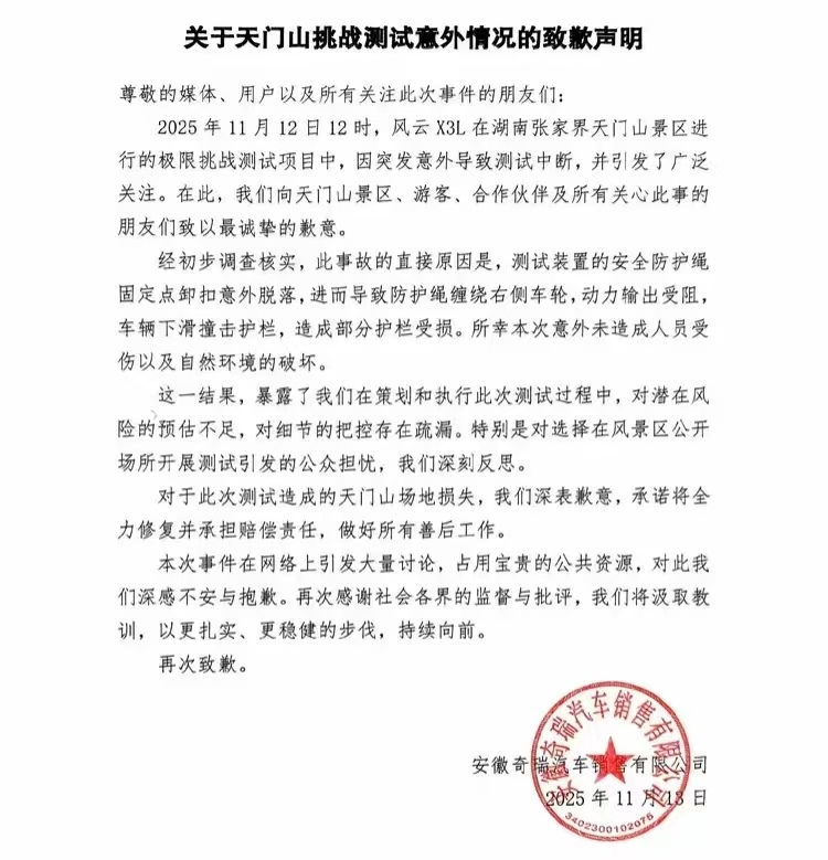 13 号凌晨,奇瑞汽车连夜发了致歉声明,字里行间满是歉意,不仅向天门山景区、受影响的游客道歉,还向所有关注这事儿的网友说了对不起。根据他们初步调查的结果,这次意外其实是个 “乌龙”—— 安全防护绳的固定扣突然掉了,绳子缠到了车的右轮上,导致车子没法正常发力,才顺着坡道滑了下去撞了护栏。万幸的是,除了几段护栏受损,没有造成人员受伤,也没破坏景区的自然环境。