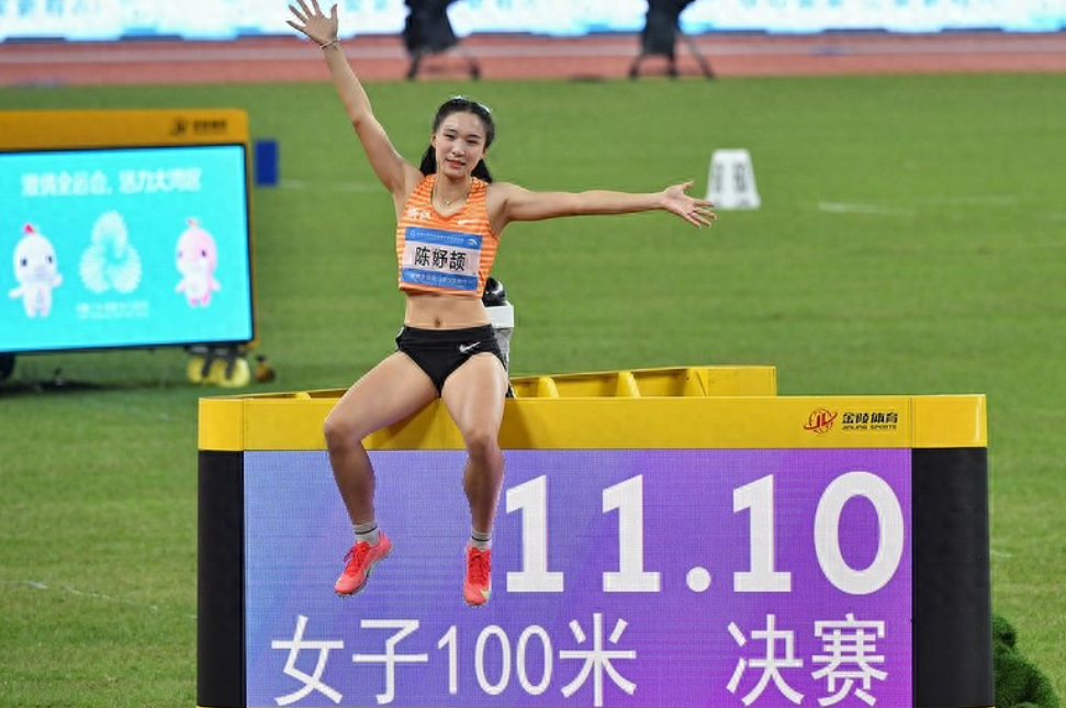 冲过终点线的那一刻,陈妤颉先回头看了眼计时器,11秒10这几个数字跳出来的时候,她愣了一下,好像还没反应过来,紧接着就高高举起胳膊,使劲儿喊了一声。这个成绩比她平时最好的成绩快了0.08秒,还把肖琳1997年在八运会上创下的11秒17的亚洲青年纪录给破了,一下子快了0.07秒。