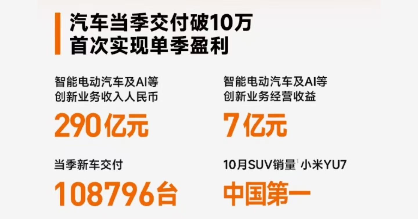 谁能想到,就在一年多前,小米汽车还处于 “日烧 3 台库里南” 的艰难阶段。2024 年二季度,汽车业务单季亏损高达 19.2 亿元,当时不少人都质疑 “小米造车到底靠不靠谱”。但随后的日子里,亏损额一步步缩减:2024 年末降到 10 亿元,2025 年一季度 5 亿元,二季度 3 亿元,每一步都走得很扎实。到了三季度,形势彻底反转,单季交付量直接突破 10.9 万辆,9 月一个月就卖了 4 万多台,这实打实的销量成了盈利的底气。