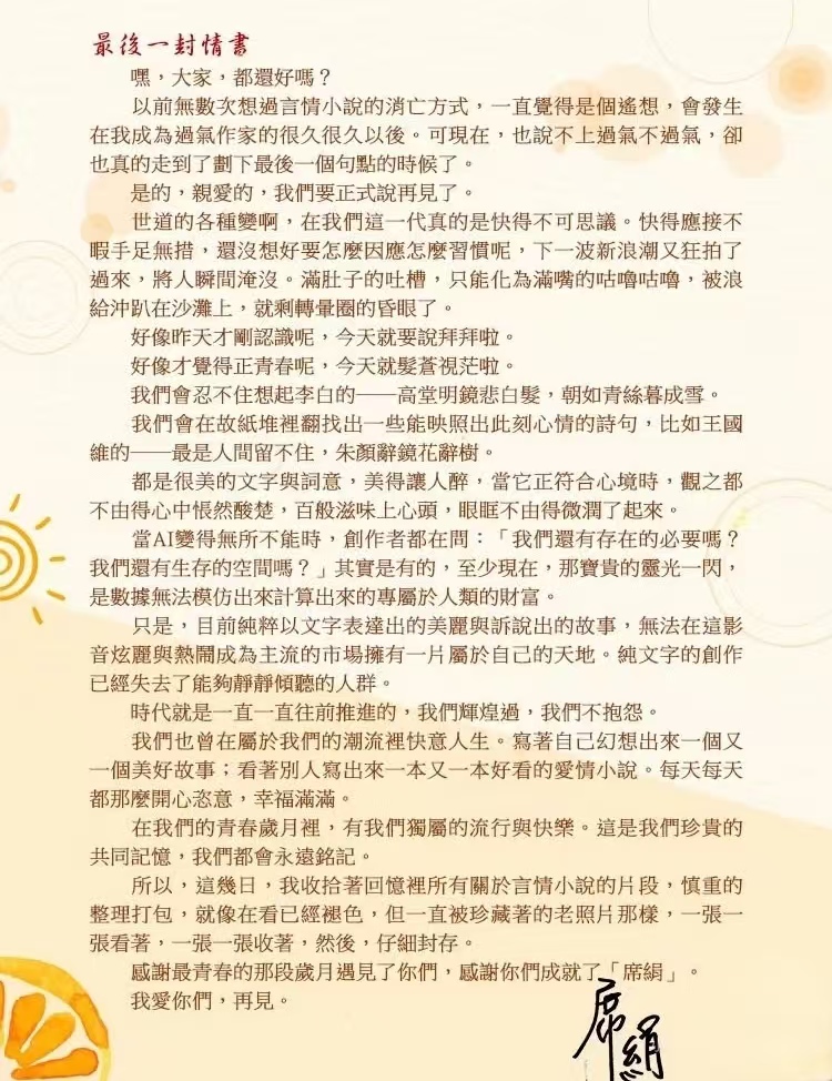 对于我们来说,席绢的小说早已不是简单的读物,而是青春回忆里的一部分。她的封笔或许是一个时代的落幕,但那些故事里的温暖与美好,那些陪伴我们成长的角色,永远不会过时。就像席绢的疑问,其实早就有了答案:AI 再强,也替代不了真人的真情实感,替代不了那些刻在我们记忆里的青春时光。