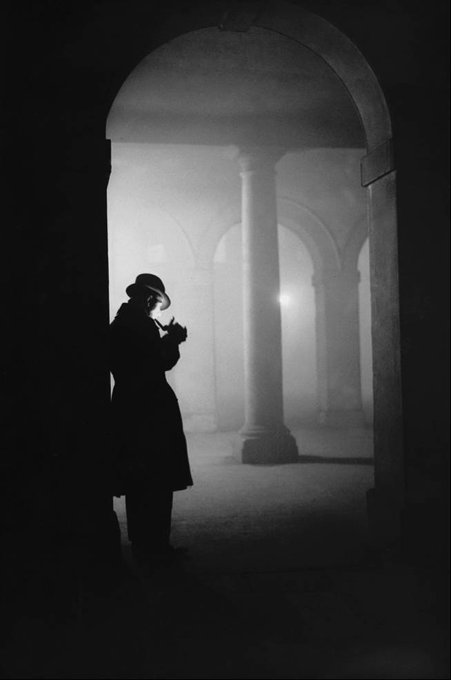 一个男人在浓雾中的拱门下点烟斗,1935年12月23日