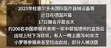 2025 年杜塞尔多夫国际医疗器械展正在德国火热举办,本来是中国医疗企业亮相全球的好机会,没想到一场大规模食物中毒让不少参展商糟了罪。200 多名中国参展人员吃完展会统一订的团餐後,集体出现上吐下泻的症状,有人甚至一晚上腹泻 40 多次、出现便血,还有 4 人被紧急送医。