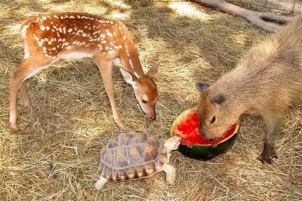 其实,这种温和不仅仅是性格问题,还和它们的生活方式有关。水豚是草食动物,不会去捕猎其他动物,所以它们对周围的小伙伴没有威胁感。再加上它们天生群居,喜欢成群结队生活,这种社交属性让它们更容易接受不同的“朋友”。在南美的野外,水豚甚至会和鸟类、龟类共享空间,鸟儿停在它们背上,它们也毫不在意,简直是“动物界的共享单车”。