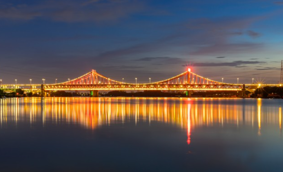 凌晨五点半,江风还带着点凉意,长江边上蒙着层淡蓝色的雾气。新大桥的轮廓已经看得真切了,银白色的桥身笔挺挺的,桥塔顶端的避雷针戳破云层,就像指着天的手指头。东边的天空慢慢亮起来,先是透着点鱼肚白,接着就染上了橘红色的霞光,把大桥的钢架子都镀成了暖乎乎的金色。桥面的沥青被晨露润得发亮,白色的交通线一条接一条铺展开,就等着车子开上来了。