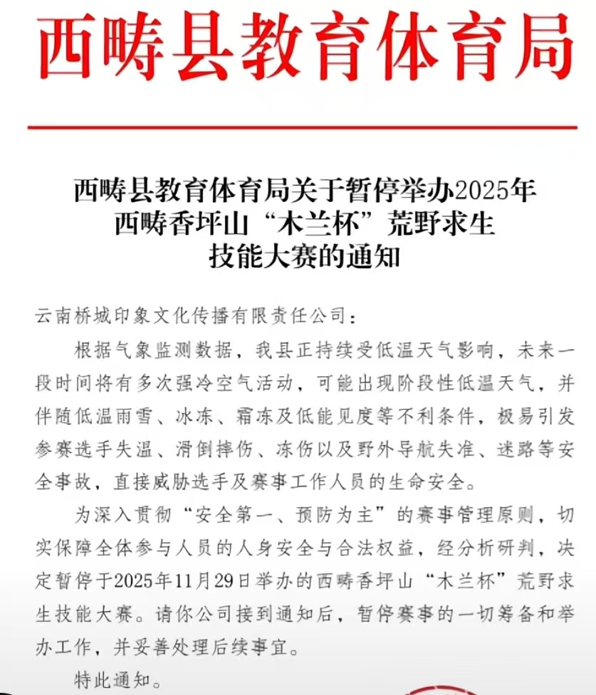 原定 11 月 29 日在云南西畴县香坪山景区举办的 “木兰杯” 荒野求生技能大赛,最近被官方紧急叫停了。县教体局已经证实了这个消息,原因很实在 —— 持续低温天气可能会影响选手的安全。这事一出来,不少人都在聊户外比赛的安全问题,毕竟不管比赛多有意思,参赛选手的平安才是最重要的。