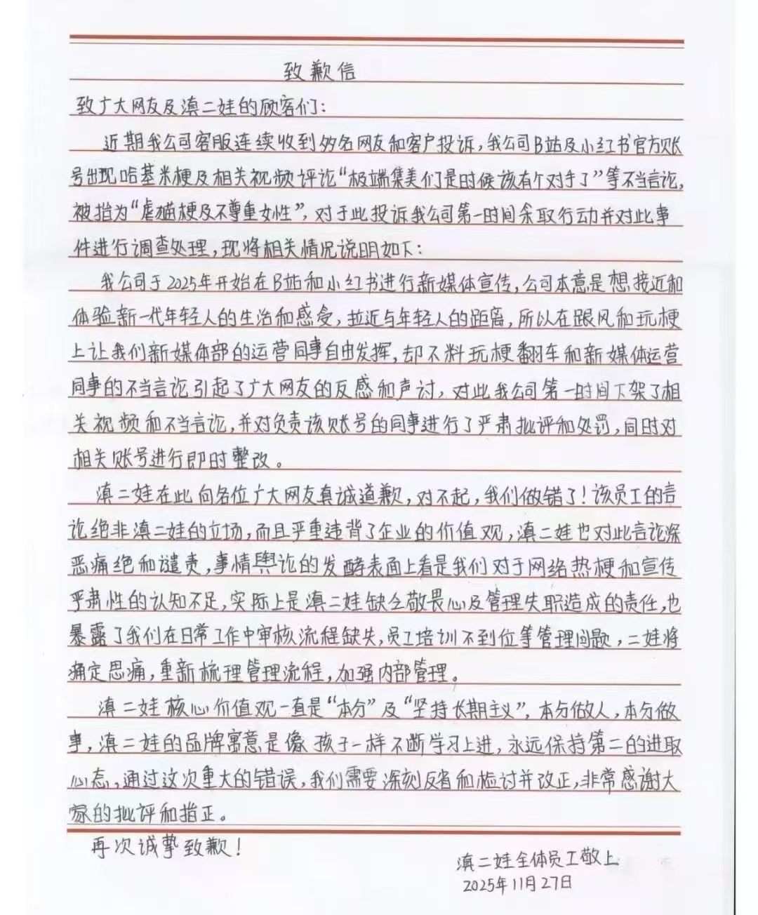 面对汹涌的舆论压力,11 月 27 日晚,“滇二娃” 官方社交账号发布了一封手写致歉信。信中明确承认 “近期发布的部分内容言论不当,违背了公序良俗,伤害了大家的情感”,并表示已对相关责任人进行严肃处罚,同时承诺 “将全面自查整改,杜绝此类事件再次发生,今后会坚守底线,传递正向价值观”。