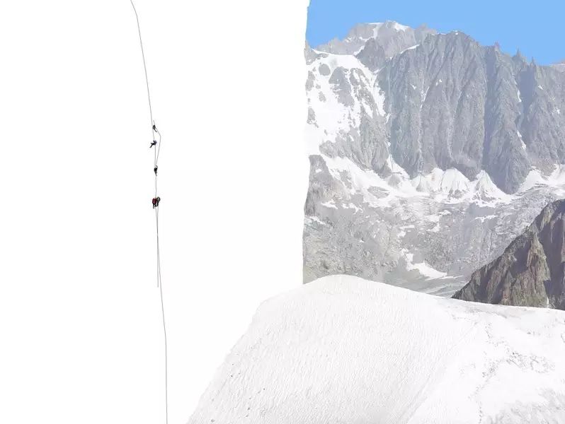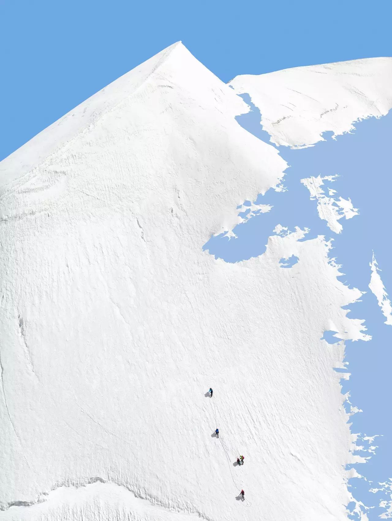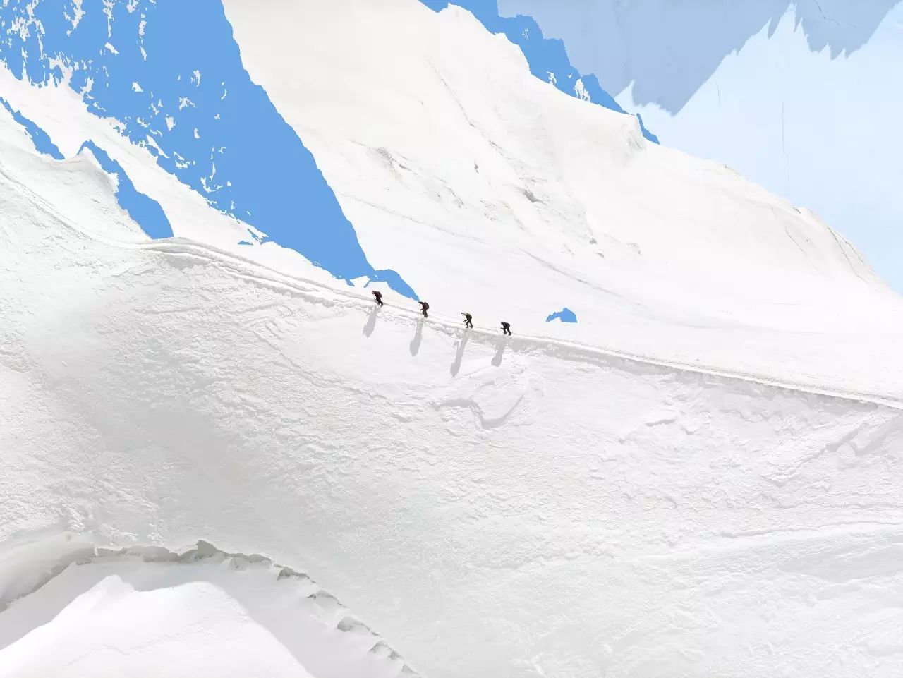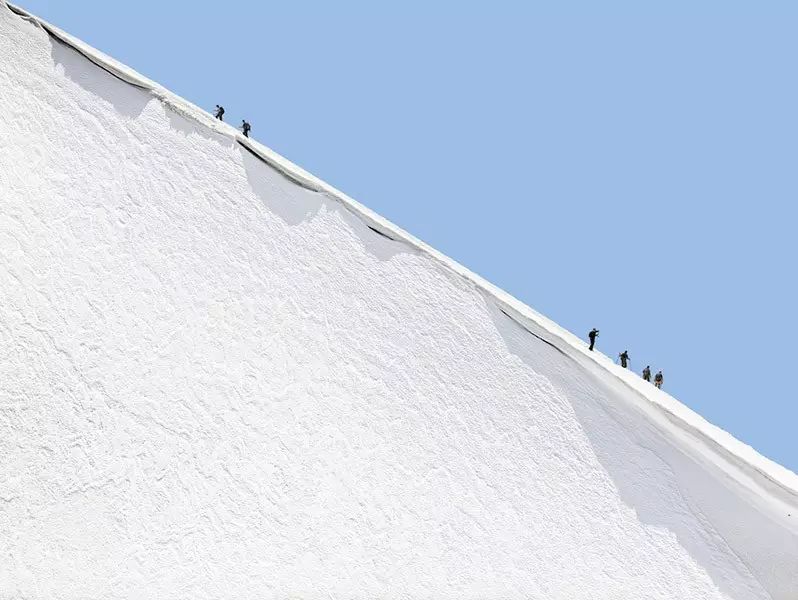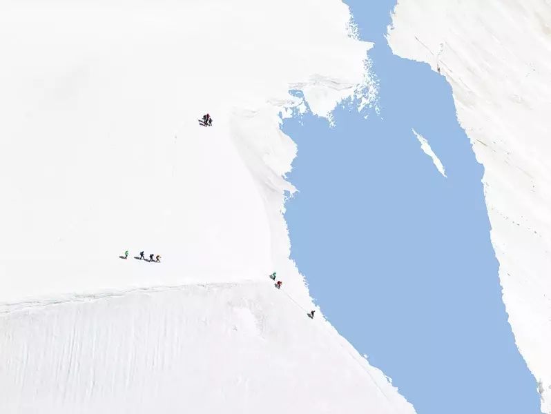 虽然在画面中,以点的形式出现的人只是非常小的存在,但他始终是一种主导性的存在,引导我们的视线,也控制我们的视线。在这样的图底(figure-ground)关系中,登山者与色彩块面之间,共同构成了丰富复杂的平面,也使得画面具备某种抽象性。当然,我们也不能忽视这些蓝色与白色的块面边缘所形成的边界线以及登山者们的缆绳作为线这个造型元素在画面中的作用。