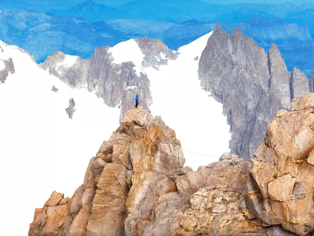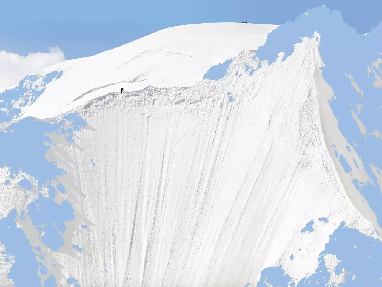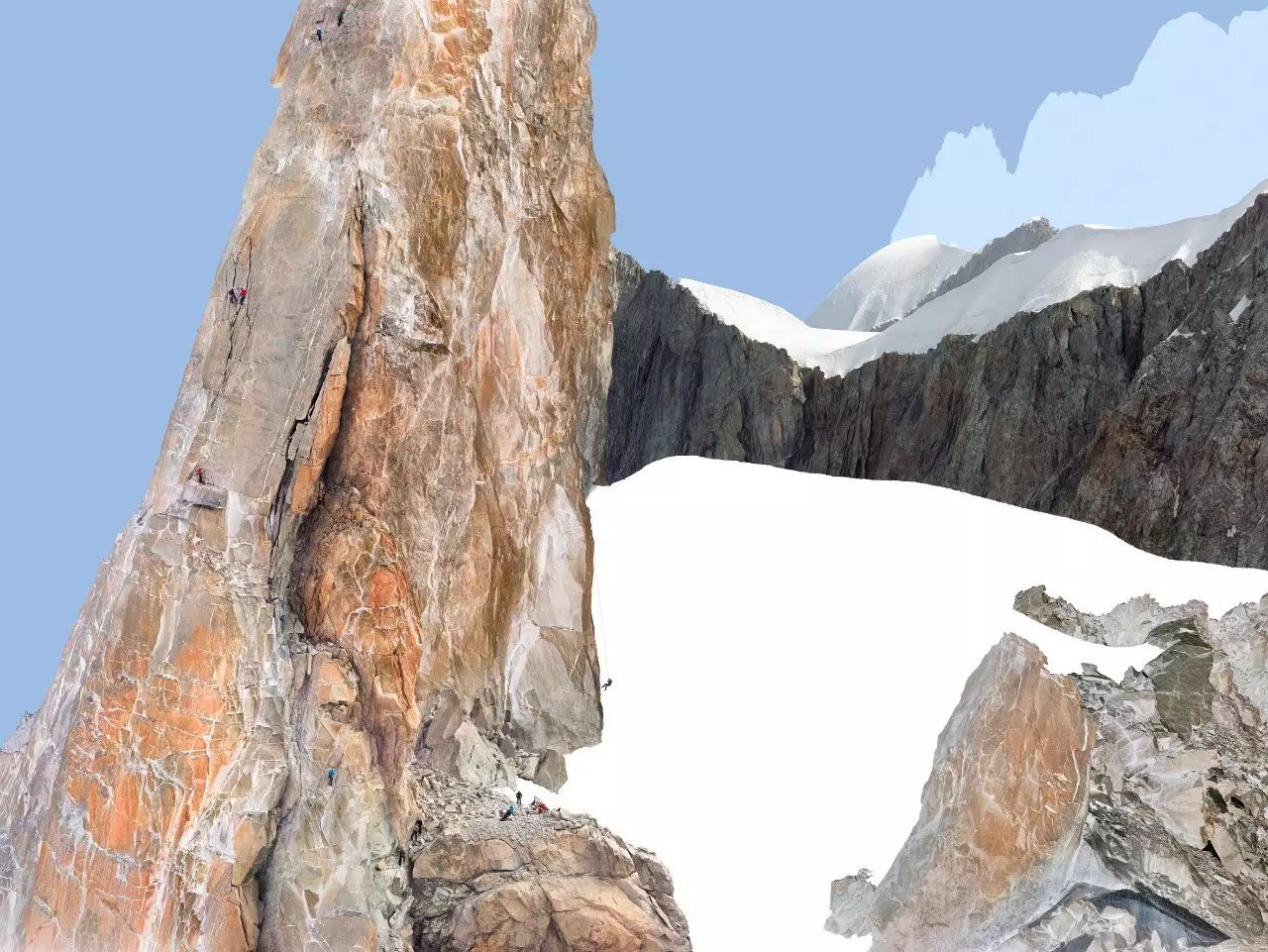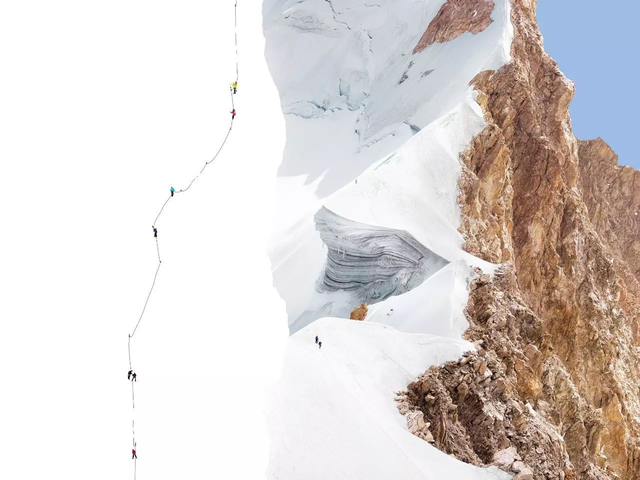 虽然在画面中,以点的形式出现的人只是非常小的存在,但他始终是一种主导性的存在,引导我们的视线,也控制我们的视线。在这样的图底(figure-ground)关系中,登山者与色彩块面之间,共同构成了丰富复杂的平面,也使得画面具备某种抽象性。当然,我们也不能忽视这些蓝色与白色的块面边缘所形成的边界线以及登山者们的缆绳作为线这个造型元素在画面中的作用。