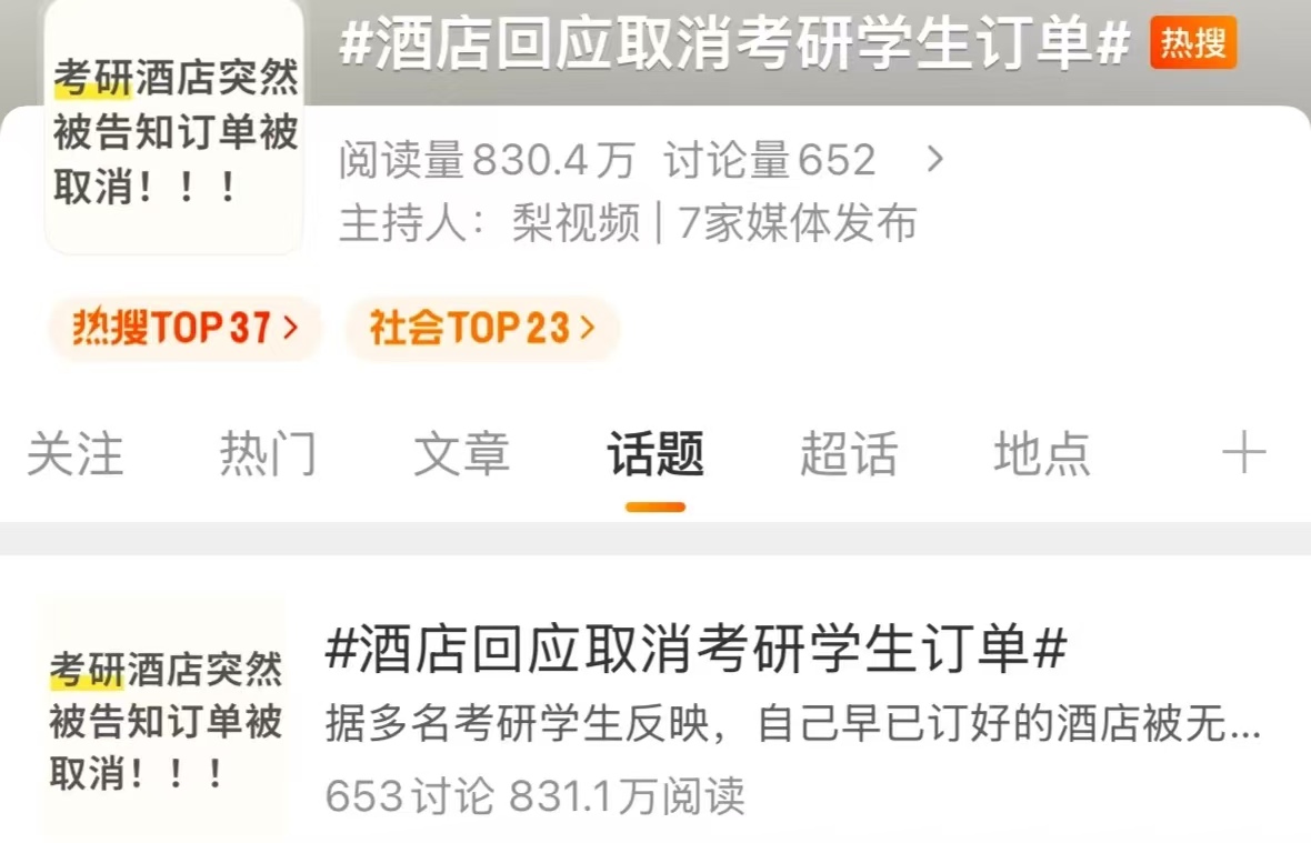 考研日子越来越近,万千考生正埋首最后的冲刺。对他们来说,提前订好考点附近的酒店,就像给考试加了层 “安心 buff”,能省下赶路的时间,多刷几套题。可谁也没想到,12 月 11 日,# 考研被酒店威胁了 #突然冲上热搜,一堆考生的吐槽把这事推到了大家眼前 —— 提前订好的酒店,说取消就取消,有的甚至还被商家威胁。