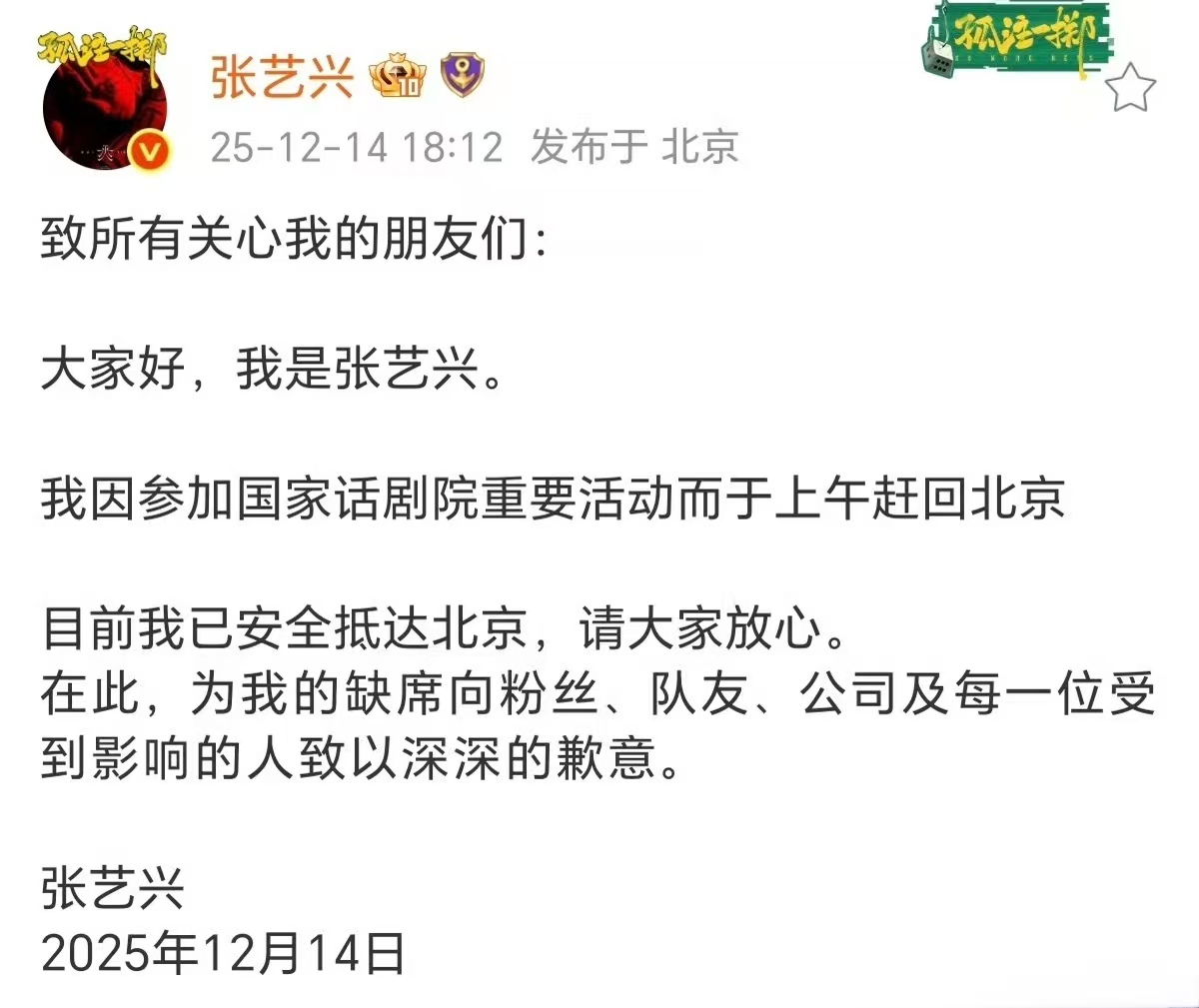 直到下午,张艺兴自己在社交平台发了文,大家才弄明白来龙去脉。他说这次没法去见面会,是因为要参加中国国家话剧院的重要活动,当天上午已经从韩国紧急赶回北京,现在已经安全到了。同时他还一个劲儿道歉,对着粉丝、队友、公司还有所有受影响的人,都表达了歉意。