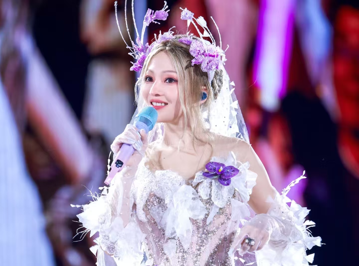 可汕头站换了新发型师刘雪亮之后,画风直接跑偏。还是那件被《VOGUE》夸过的米色高定长裙,结果配了个紧贴头皮的短发,网友笑称 “好好的精灵变坐月子阿姨”;还有个 2.5 公斤的金属头饰,搭着廉价感十足的亮紫色长发,被吐槽像 “紫色蚁后”;更离谱的是唱《阿刁》的时候,穿的蓝色亮片裙皱巴巴的,还配了个 “愤怒的小鸟” 同款羽毛头饰,完全没了歌曲的力量感,反倒像在演滑稽戏。后面泉州站的羊毛卷、粗辫子也没好到哪去,深色头发把颅顶低的缺点全暴露了,看着又土又显老,粉丝越看越气。