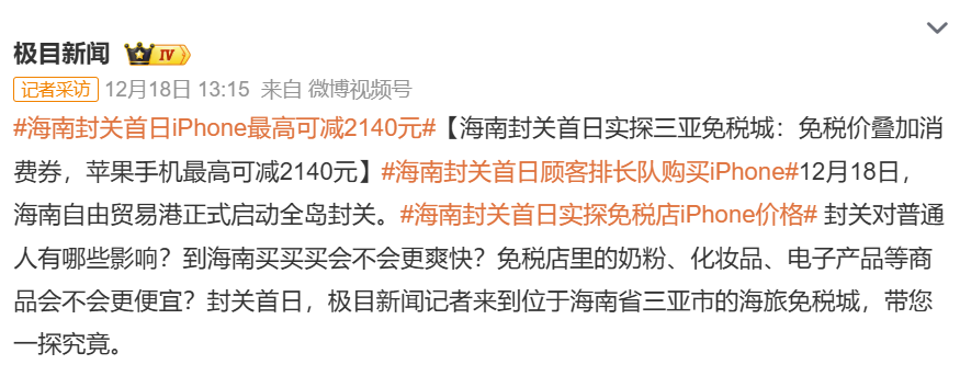 除了苹果手机,免税城内奶粉、化妆品、电子产品等也吸引了大量消费者。封关后,免税购物政策进一步优化,价格优势明显,购物体验更便捷。业内人士表示,封关不仅意味着海南自由贸易港建设进入新阶段,也让消费者在海南购物更具吸引力,尤其是高端电子产品和国际品牌,优惠力度值得关注。