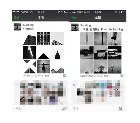 它们或构图极简、富于韵律或者有故事性的构成,最终的朋友圈呈现出的效果如图: