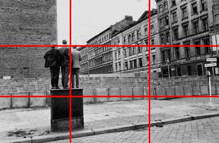 在这种法中摄影师需要将场景用两条竖线和两条横线分割,就如同是书写中文的“井”字。再将表现的重点放置在4个交叉点中的一个即可。