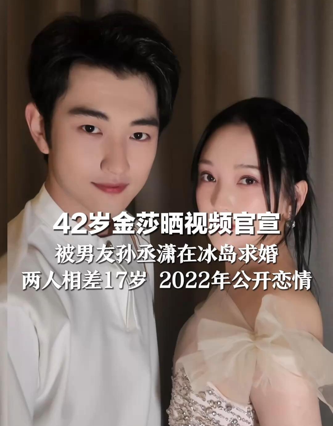42岁的金莎近日在冰岛收获了一场浪漫求婚,男友孙丞潇精心策划了这一惊喜,现场布置唯美,氛围充满仪式感。这段姐弟恋自曝光以来一直备受关注,两人年龄差达到17岁,孙丞潇出生于2000年,金莎则是娱乐圈出道多年的歌手和演员。