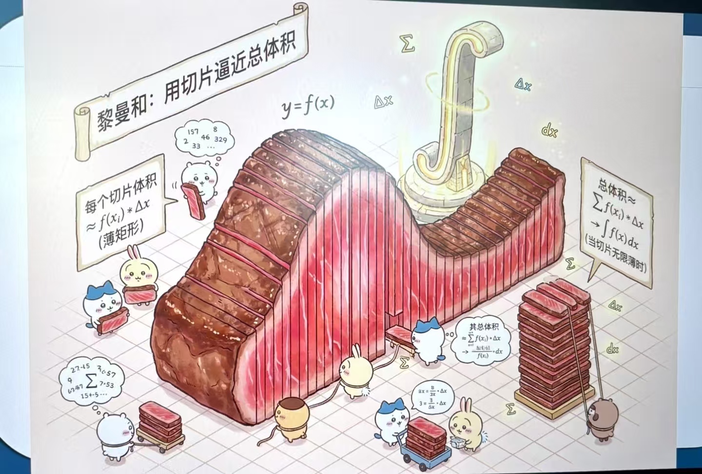 其实在此之前,微积分里的体积积分一直是很多学生的“老大难”。旋转体到底是啥、公式咋推导的,不少人就算死记硬背把公式记住了,也搞不懂背后的逻辑。而老师手里的这根烤肠,正好解决了“抽象难理解”的问题。当烤肠被当成旋转的几何体,每一片薄肠片就对应着“圆盘法”里的基本单元,以前得在脑子里费劲构建的模型,一下子变成了能摸到、甚至能想象出味道的实物。有学生课后说,以前看到积分符号就头疼,现在一想到“切烤肠”,就能想起体积怎么算,把知识和生活里的东西绑在一起,比死记硬背管用多了。还有学生主动带零食去上课,希望老师用同样的方法讲其他难点,原本沉闷的课堂也变得热闹起来。