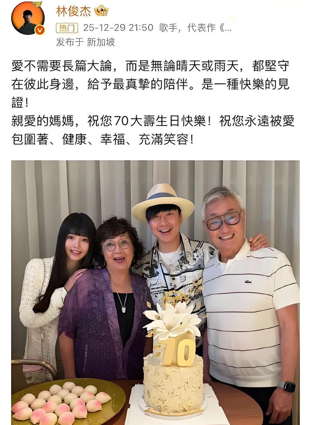 12月29日,林俊杰在母亲70岁生日宴上晒出家庭合照,照片中首次出现其新女友七七,正式官宣恋情。