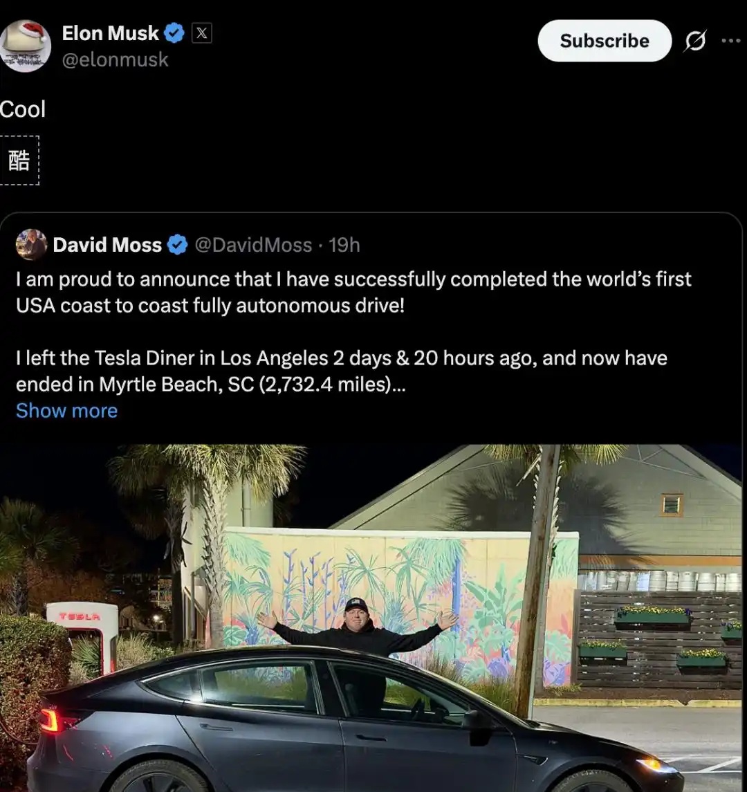 近日,一项颠覆行业的壮举引发全球关注。特斯拉车主大卫·摩斯驾驶搭载FSD V14.2.1.25版本(简称FSD V14)的Model 3,从美国西海岸洛杉矶出发,最终抵达东海岸南卡罗来纳州的默特尔海滩,完成了全程自动驾驶横穿美国的挑战。