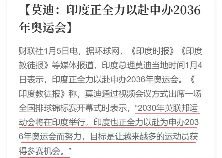 当地时间1月4日,印度总理莫迪通过视频会议发声:印度正在全力申办2036年夏季奥运会,核心想法就是让更多本土运动员能站上这个世界顶级的体育舞台。这一消息不仅让印度酝酿了几十年的“奥运主办梦”再次升温,也把这个南亚大国的体育野心和国家发展计划绑在了一起,很快就在国际体育圈引发了广泛讨论。