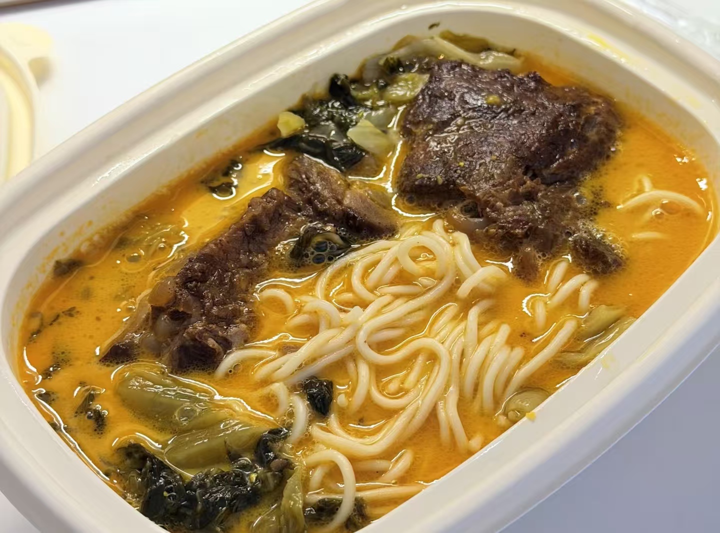 山东济南的王女士,就想找家不是预制菜的馆子吃碗面,最终选了主打“养生面”的和府捞面。可这顿饭吃完,她心里满是失望——原本以为能吃到店家宣传的“慢火熬汤”“现炒浇头”,结果开放式后厨里的一幕让她傻了眼:后厨师傅根本没熬汤、没炒菜,就从货架上拿了袋装食材,撕开一包稠乎乎的褐色调料包倒进碗里,再浇上一勺热好的汤,几分钟就端出了一碗29块钱的“草本酸辣肥牛面”。从头到尾,也就面条是现煮的。