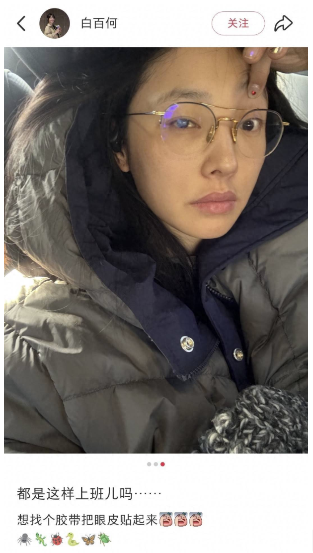近日,白百何在社交平台晒出一组自己上班时的素颜照片,并配文调侃:都是这样上班吗?好想找个胶带把眼皮贴起来。