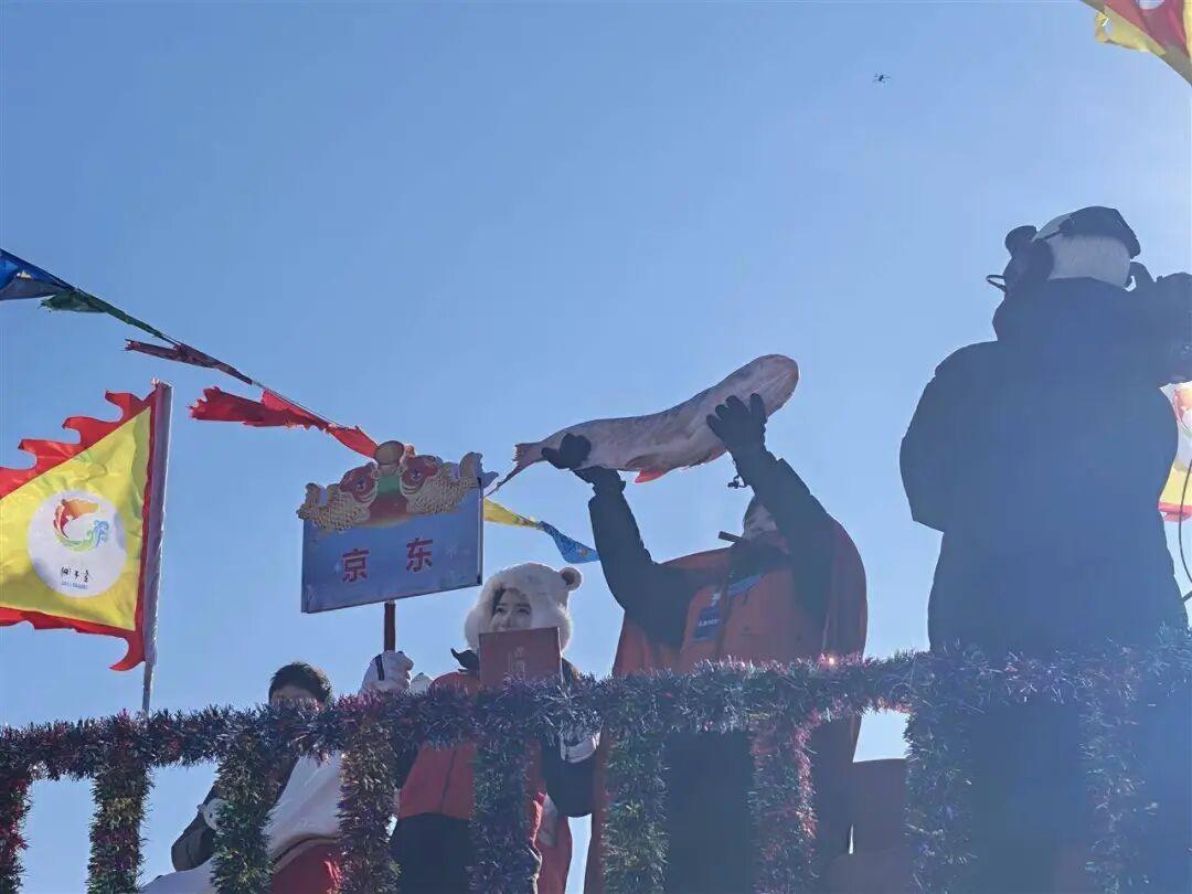 上午11时左右,冬捕习俗代表性第二十代传承人张文带领渔工从冰下拉出这条重达38斤的胖头鱼,寓意丰收与好运。拍卖起价为299999元,京东、松粮集团、前郭农垦集团等多家企业参与竞拍,最终京东拔得头筹。京东主播李春阳在现场高举“头鱼”,与观众分享竞拍成功的喜悦,许多游客上前触摸鱼身,希望沾一份好彩头。