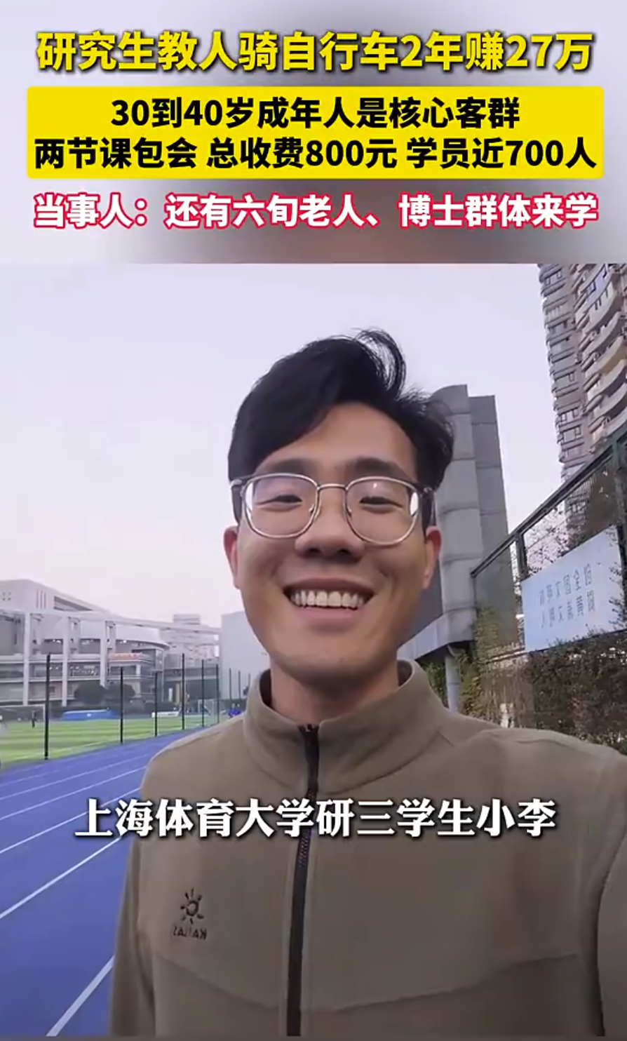近日,一位来自上海体育大学的研三学生小李因独特的创业项目引发关注。他将“上门教成人骑自行车”作为创业方向,短短两年时间累计收入达到27万元,教授学员近700人,成为不少人眼中的“新兴技能服务”代表。